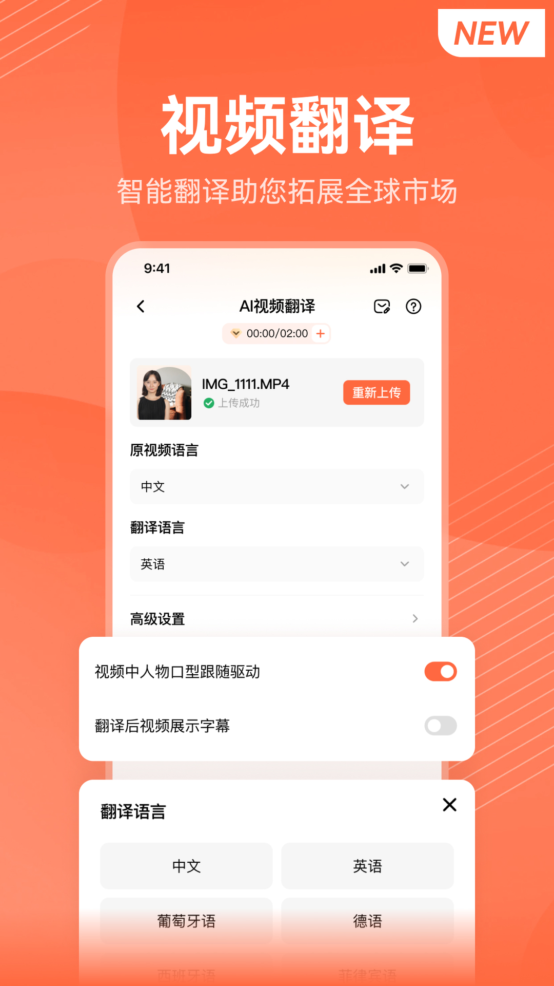- AI视频翻译:通过语音识别技术,将视频中的语音转换成不同语言,并生成字幕。
