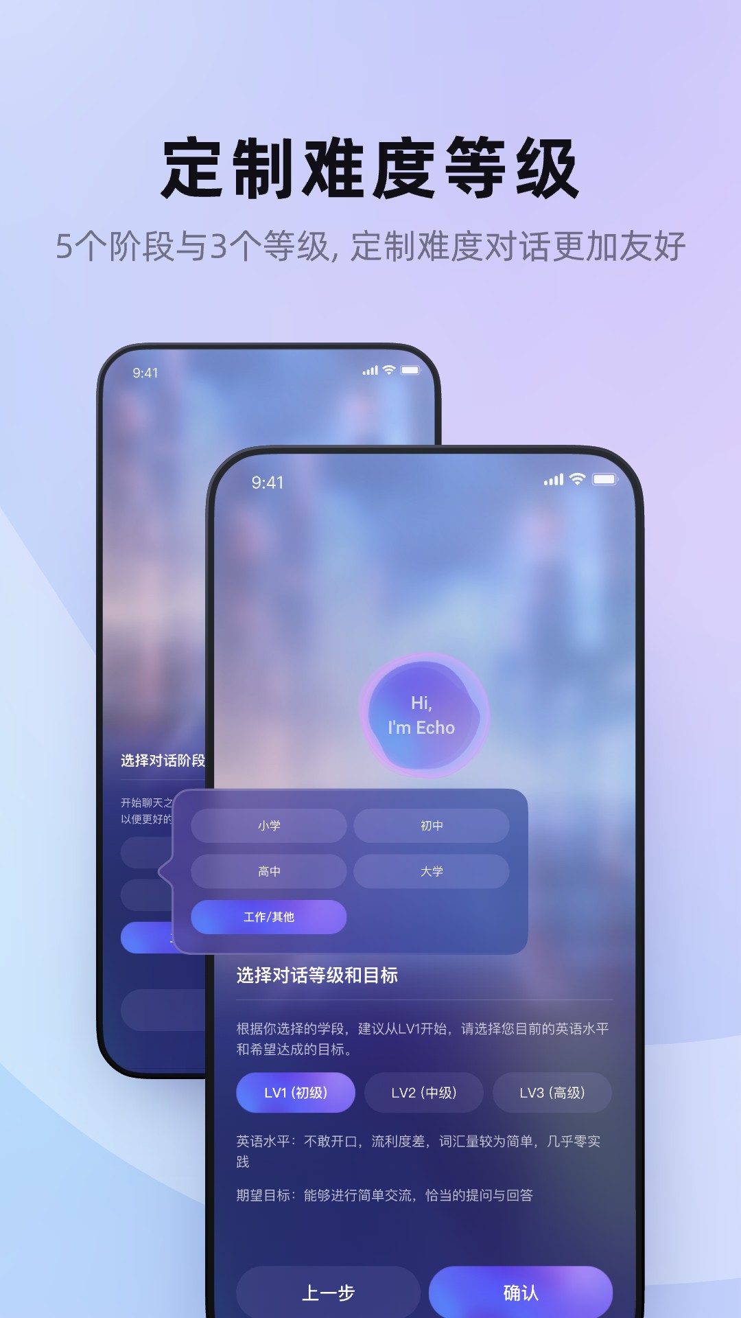 - 虚拟人口语教练:提供24小时在线的虚拟人Echo作为私人口语教练,随时待命进行口语练习。