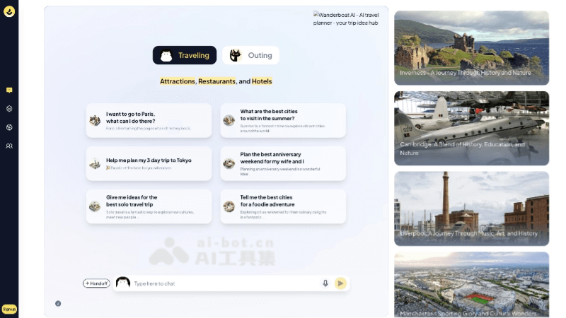 Wanderboat 是一款由GPT-4 驱动的智能旅行规划助手,通过对话式AI帮助用户轻松规划个性化的旅行。你只需通过聊天就能获得定制的旅行建议,包括景点、美食和活动推荐。Wanderboat 利用AI大数据分析,根据你的偏好即时生成行程,并提供带有视频和图片的丰富信息。还可以通过链接分享旅行计划,享受便捷和社交化的旅行规划服务。