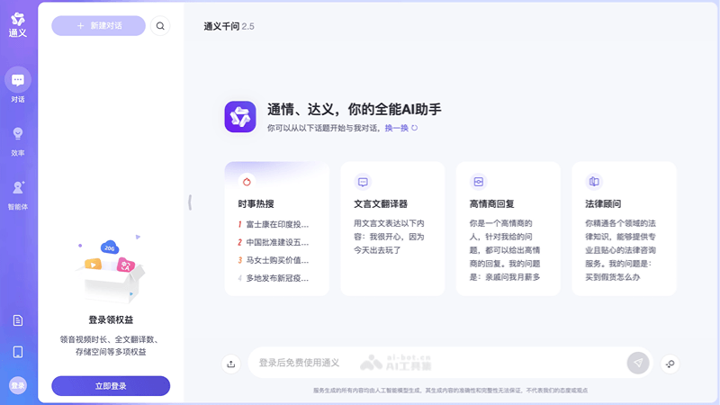 通义千问的官网是tongyi.ai ,打开网址后,可以看到它的自我介绍:“通情、达义,你的全能AI助手”。