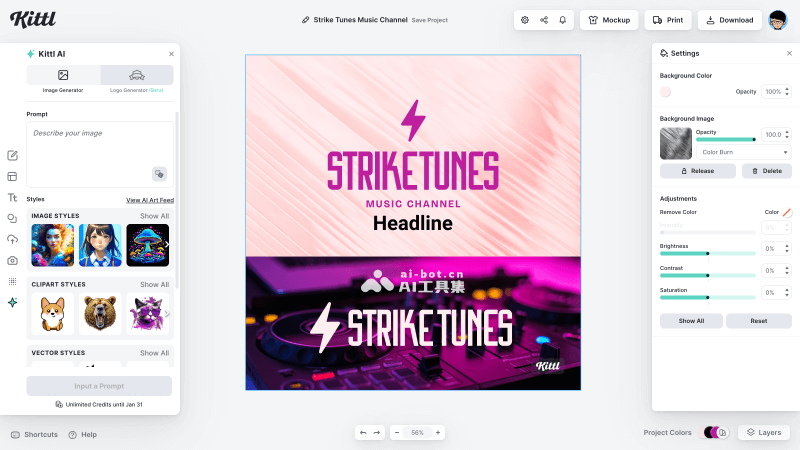 - 添加和编辑文字/元素/颜色等,也可以使用Kittl AI输入提示词进行生成