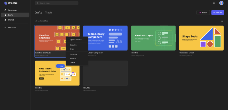 - 点击Import可从Sketch、Figma、Adobe XD等软件导入设计稿,也可以点击New file创建新文件
