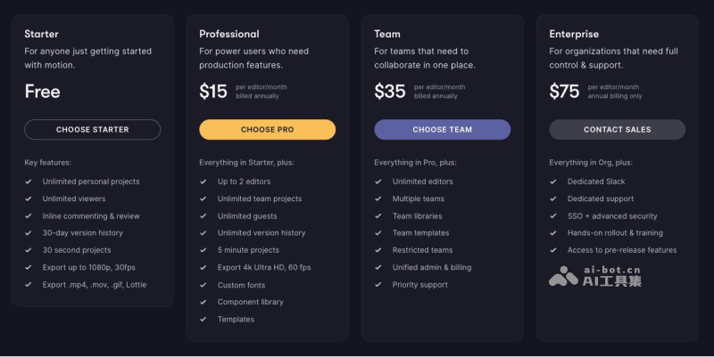 - 免费版:提供免费无限的个人项目,不限查看人数、支持评论、30天版本历史记录、创建30秒的项目、导出1080P/30FPS的视频、导出为.mp4/.mov/.gif/lottie格式
