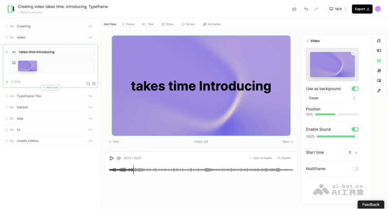 - 文本到视频转换:Typeframes的核心功能之一,允许用户输入产品介绍文本,然后平台会自动将其转换为视频。这个过程中,用户可以选择不同的视觉效果和动画来增强文本的表现力。