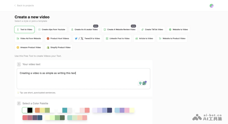 - 选择Text to Video或其他视频生成模版,输入视频文案脚本、选择颜色主题和背景音效