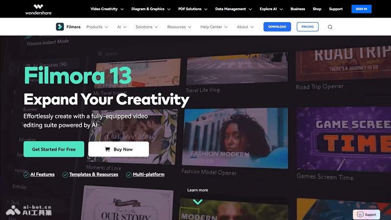 Filmora是万兴科技推出的AI视频编辑工具,Filmora提供了剪辑、合并、添加特效、转场、文本和字幕编辑等功能,适合初学者和中级视频编辑者使用。Filmora支持多轨编辑,内置大量音乐和音效资源,以及各种滤镜和动画效果。Filmora还具备一些高级功能,如颜色校正、音频编辑和关键帧动画,能满足更专业的视频制作需求。Filmora支持多种视频格式,便于用户导入和导出视频项目。