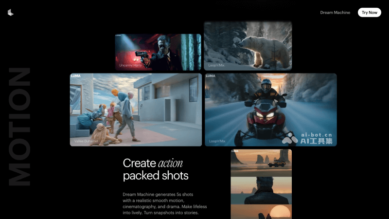 Dream Machine是由人工智能公司Luma AI推出的一款AI视频生成工具,利用先进的人工智能技术,可根据用户输入的简单文本描述或上传的图片,快速生成高质量的视频片段(120秒即可生成120帧的视频)。该AI视频生成系统不仅能够理解文本中的指令,还能准确渲染出指定的对象、角色、动作和环境,同时保持视频的流畅动作和连贯叙事。