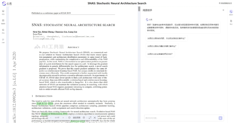 - 此外,用户可点击左边的阅读进行长篇论文阅读分析