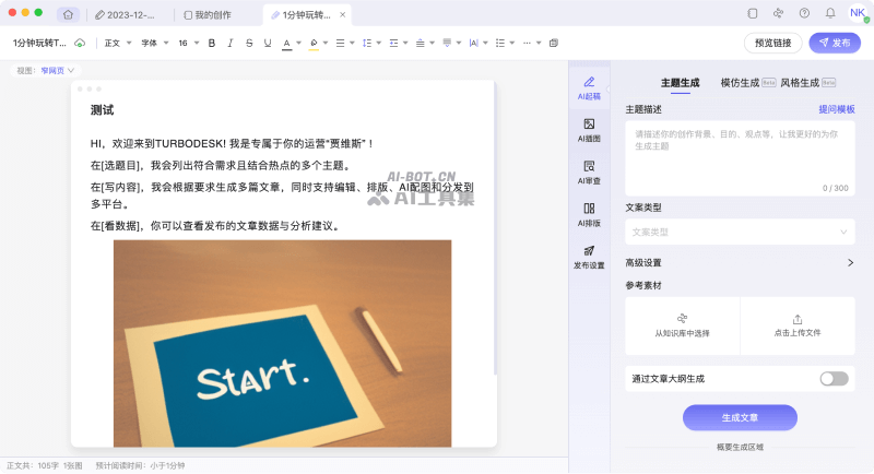 - AI起稿:根据用户输入的主题或关键词,快速生成文章草稿。