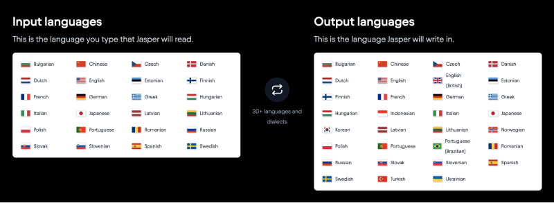 Jasper支持30+的语言和方言进行AI写作,包括中文、英语(美式)、英语(英式)、保加利亚语、捷克语、丹麦语、荷兰语、爱沙尼亚语、芬兰语、法语、德语、希腊语、匈牙利语、印尼语、意大利语、日语、韩语、拉脱维亚语、立陶宛语、挪威语、波兰语、葡萄牙语、葡萄牙语(巴西)、罗马尼亚语、俄罗斯语、斯洛伐克语、斯洛文尼亚语、西班牙语、瑞典语、土耳其语、乌克兰语等。