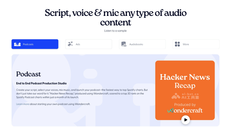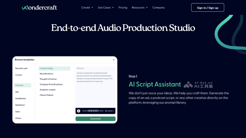 - AI脚本助手:Wondercraft AI可帮助用户构思和生成播客、广告或其他音频内容的脚本,提供创意支持,帮助用户节省时间并提高内容质量。